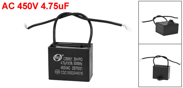 Product Name Motor Capacitor Model CBB61 Material(External) Plastic, Polypropylene Rated Capacitance 4.75uF Tolerance ±5% Rated Frequency 50/60Hz Rated Voltage 450V AC Size 4.1 x 3.2 x 3.3cm/1.6" x 1.2"x 1.3"(L*W*H) Cable Length 9.5cm/3.7" Color Black Weight 36g Package Content 1 x Motor Run Capacitor - Reviews