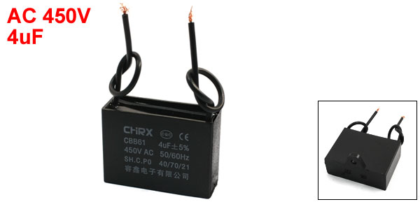 Product Name Motor Run Capacitor Model CBB61 Material Metalized Polypropylene Film Rated Capacitance 4uF Tolerance 5% Operating Temperature 40/70/21 Rated Frequency 50/60 Hz Rated Voltage 450V AC Size 4.7 x 3.5 x 1.7cm/ 1.9" x 1.4" x 0.7"(L*W*H) Lead Length 13cm/ 5.1" Weight 40g Package Content 1 x Motor Run Capacitor - Reviews