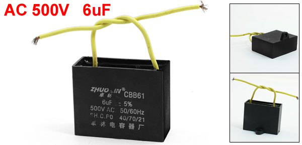 Product Name Motor Capacitor Model CBB61 External Material Plastic Dielectric Material Metalized Polypropylene Film Rated Capacitance 6uF Tolerance ±5% Frequency 50/60Hz Rated Voltage AC 500V Body Size 4.6 x 2.1 x 3.3cm/ 1.8" x 0.8" x 1.3"(L*W*T) Mount Hole Diameter 4mm/0.16" Cable Length 10cm/ 3.9" Net Weight 36g Package Content 1 x Motor Capacitor - Reviews