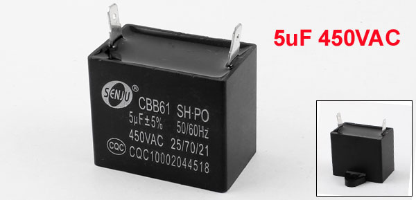 Product Name Motor Capacitor Housing Material Plastic Dielectric Material Metallized Polypropylene Film Model CBB61 Capacitance 5uF Tolerance ±5% Rated Voltage 450VAC Frequency 50/60Hz Temperature 25~70 Celsius Degree Pin Spacing (Approx.) 3cm/ 1.18" Overall Size 3.8 x 2.3 x 3.2cm/1.5'' x 0.9'' x 1.26'' (L*W*H) Color Black Weight 34g Package Content 1 x Motor Capacitor - Reviews