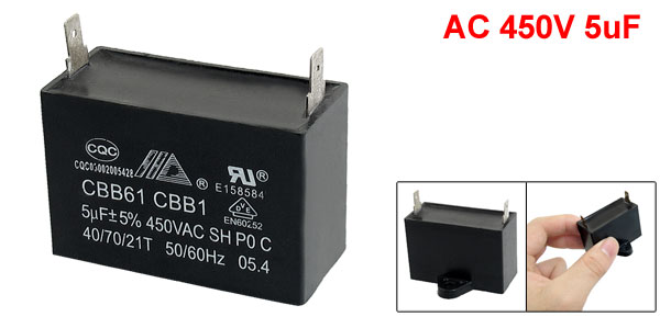Product Name Motor Run Capacitor Model CBB61 Material Polypropylene Film Rated Capacitance 5uF Tolerance +/-5% Rated Frequency 50/60 Hz Rated Voltage 450V AC Temperature Operating 40/70/21T Overall Size 47 x 36 x 23mm/ 1.9" x 1.5" x 0.9"(L*W*H) Hole Dia 4mm/ 0.157" Pin Size 7 x 5mm/ 0.28" x 0.196"(L*W) Main Color Black Weight 51g Package Content 1 x Motor Run Capacitor - Reviews