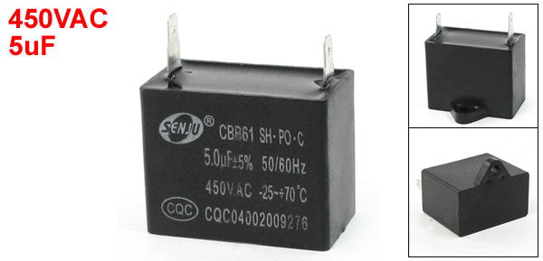 Product Name Motor Run Capacitor Material Polypropylene Film Rated Capacitance 5uF Tolerance ±5% Model CBB61 Rated Frequency 50/60 Hz Rated Voltage 450V AC Overall Size 40 x 23 x 32mm/ 1.6" x 0.9" x 1.26"(L*W*T) Mount Hole Dia 4mm/ 0.16" Pin Spacing 34mm/ 1.34" Main Color Black Weight 37g Package Content 1 x Motor Run Capacitor - Reviews