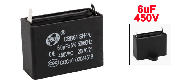 Product Name Motor Capacitor Housing Material Plastic Dielectric Material Polypropylene Film Model CBB61 Capacitance 6uF Tolerance ±5% Rated Voltage 450VAC Frequency 50/60Hz Temperature -25~70 Celsius Degree Pin Spacing(Approx.) 4.1cm/1.6'' Overall Size 4.7 x 3.2 x 4cm/1.9'' x 1.3'' x 1.6'' (L*W*H) Color Black Weight 35g Package Content 1 x Motor Capacitor - Reviews