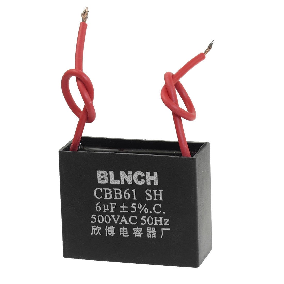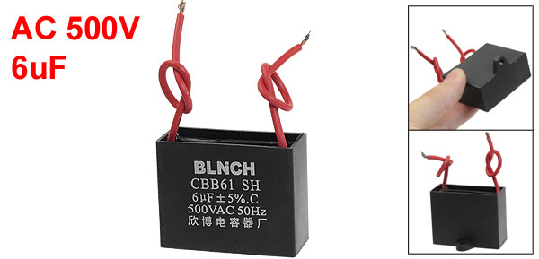 DetailsCBB61 6uF AC 500V Polypropylene Film Motor Run Capacitor  Product Name Motor Capacitor Model CBB61 External Material Plastic Dielectric Material Metalized Polypropylene Film Rated Capacitance 6uF Tolerance +/-5% Rated Frequency 50Hz Rated Voltage AC 500V Body Size 4.8 x 2 x 3.8cm/ 1.9" x 0.8" x 1.5"(L*W*T) Mount Hole Diameter 4mm/0.16" Cable Length 9cm/ 3.5" Net Weight 39g Package Content 1 x Motor Run Capacitor
