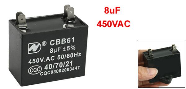 Product Name Motor Capacitor Housing Material Plastic Dielectric Material Polypropylene Film Model CBB61 Capacitance 8uF Tolerance ±5% Temperature 40/70/21 Rated Voltage 450VAC Frequency 50/60Hz Pin Spacing(Approx.) 2.8cm/1.1'' Overall Size 4.6 x 3.8 x 4.5cm/1.8'' x 1.5'' x 1.7''(L*W*H) Color Black Weight 60g Package Content 1 x Motor Capacitor - Reviews