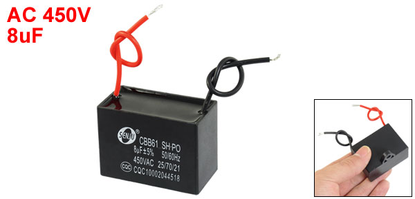 Product Name Motor Capacitor Model CBB61 External Material Plastic Dielectric Material Metalized Polypropylene Film Rated Capacitance 8uF Tolerance +/-5% Rated Frequency 50/60Hz Rated Voltage AC 450V Body Size 4.9 x 3.5 x 2.5cm/ 1.9" x 1.4" x 1"(L*W*T) Fixing Hole Diameter 5mm/0.2" Cable Length 9cm/ 3.5" Net Weight 50g Package Content 1 x Motor Run Capacitor - Reviews