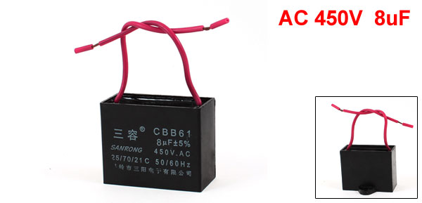 Product Name Motor Capacitor Model CBB61 External Material Plastic Dielectric Material Polypropylene Film Rated Capacitance 8uF Tolerance ±5% Rated Frequency 50/60Hz Rated Voltage AC 450V Ambient Temperature 25/70/21 Body Size 4.8 x 2.2 x 3.8cm/ 1.9" x 0.9" x 1.5"(L*W*T) Mount Hole Diameter 4mm/0.162" Cable Length 7cm/ 2.8" Net Weight 41g Package Content 1 x Motor Run Capacitor - Reviews