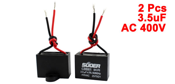 Product Name Motor Capacitor Model CBB61 Color Black External Material Plastic Dielectric Material Metallized Polypropylene Film Rated Capacitance 3.5uF Tolerance ±5% Rated Frequency 50/60Hz Rated Voltage AC 400V Body Size 38 x 28 x 18mm/ 1.5" x 1.1" x 0.7"(L*W*T) Fixing Hole Diameter 5mm/0.2" Cable Length 10cm/ 3.9" Net Weight 50g Package Content 2 x Motor Run Capacitor - Reviews