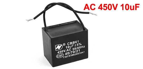 Product Name Polypropylene Film Capacitor Dielectric Material Polypropylene Model CBB601 Capacitance 10uF Tolerance ±5% Rated Voltage 450VAC Frequency 50/60Hz Body Size 4.7 x 4 x 3.2cm/ 1.9" x 1.6" x 1.3" (L*W*H) Cable Length 9cm/ 3.5" Color Black Weight 74g Package Content 1 x Polypropylene Film Capacitor - Reviews