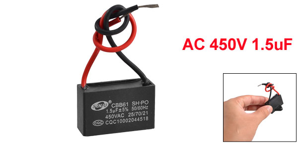 Terminal Wire Ambient Temperature 25/70/21 Rated Capacitance 1.5uF Tolerance +/- 5% Rated Frequency 50/60Hz Rated Voltage 450V AC Size 3.5 x 2.2 x 2.5cm/ 1.4" x 0.86" x 0.97"(L*W*T) Wire Length 10cm/ 3.9" Install Bore Diameter 0.45cm/ 0.17" Main Color Black, Red Weight 14g Package Content 1 x Motor Run Capacitor - Reviews