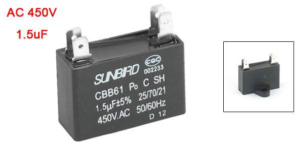 Product Name Motor Run Capacitor Model CBB61 Material Polypropylene Film Rated Capacitance 1.5uF Tolerance ±5% Rated Frequency 50/60 Hz Rated Voltage 450V AC Overall Size 3.7 x 3.4 x 2.5cm/ 1.5" x 1.3" x 1"(L*W*H) Mount Hole Dia 5mm/ 0.2" Pin Size 8 x 5mm/ 0.3" x 0.2"(L*W) Pin Spacing 22 x 5mm/ 0.9" x 0.2"(L*W) Main Color Black Net Weight 16g Package Content 1 x Motor Run Capacitor - Reviews