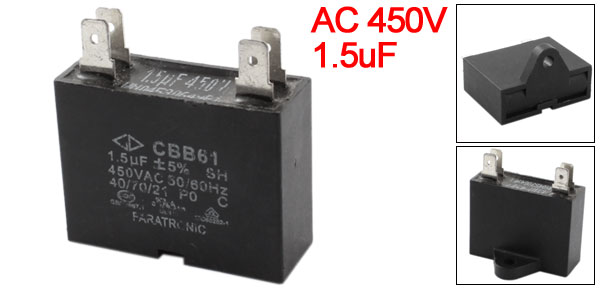 Product Name Ceiling Fan Capacitors Model CBB61 For Ceiling Fan, Air Conditioner Rated Voltage AC 450V Capacitance 1.5uF Tolerance ±5% Temperature Coefficient 40/70/21 Pin Count 4 Pin Spacing(Approx.) 27 x 4.5mm/1.1" x 0.18"(L*W) Overall Size(Not Included Pin) 3.7 x 2.8 x 1.4cm/1.5" x 1.1" x 0.55"(L*W*H) Fixing Hole Dia 4.5mm/0.18" Main Material Polypropylene Film Color Black Weight 20g