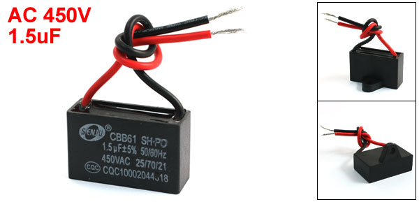 Product Name Motor Capacitor Model CBB61 Color Black External Material Plastic Dielectric Material Metalized Polypropylene Film Rated Capacitance 1.5uF Tolerance ±5% Rated Frequency 50/60Hz Rated Voltage AC 450V Ambient Temperature 25/70/21 Body Size 35 x 22 x 13mm/ 1.4" x 0.87" x 0.5"(L*W*T) Fixing Hole Diameter 4mm/0.15" Cable Length 9cm/ 3.5" Net Weight 15g Package Content 1 x Motor Run Capacitor - Reviews
