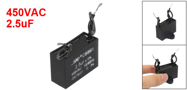 Product Name Capacitor Model CBB61 Dielectric Material Metallized Polypropylene External Material Plastic Rated Capacitance 2.5uF Tolerance ±5% Rated Frequency 50/60Hz Rated Working Voltage 450VAC Mounting Hole Diameter 4.5mm / 0.17" Boby Size 4 x 1.6 x 2.8cm / 1.58" x 0.63" x 1.1" (L*W*H) Wire Length(Each) 8cm / 3.14" Main Color Black Weight 25g Package Content 1 x Capacitor - Reviews