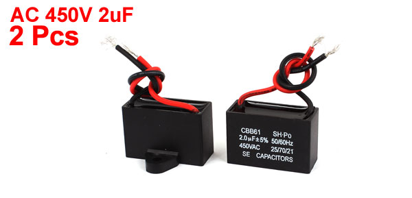Product Name Motor Capacitor Model CBB61 External Material Plastic Dielectric Material Metallized Polypropylene Rated Capacitance 2uF Tolerance ±5% Rated Frequency 50/60Hz Rated Voltage AC 450V Size 38 x 25 x 16mm/ 1.5" x 1" x 0.6" (L*W*T) Hole Dia. 5mm/ 0.2" Cable Length 10cm/ 4" Weight 41g Package Content 2 x Motor Run Capacitor - Reviews