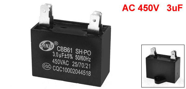 Product Name Motor Run Capacitor Model CBB61 Material Polypropylene Film Rated Capacitance 3uF Tolerance ±5% Rated Frequency 50/60 Hz Rated Voltage 450V AC Overall Size 3.7 x 3.4 x 2.5cm/ 1.5" x 1.3" x 1"(L*W*H) Mount Hole Dia 5mm/ 0.2" Pin Size 8 x 5mm/ 0.3" x 0.2"(L*W) Pin Spacing 22 x 5mm/ 0.9" x 0.2"(L*W) Main Color Black Net Weight 16g Package Content 1 x Motor Run Capacitor - Reviews