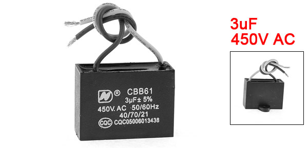 Product Name Motor Run Capacitor Model CBB61 Material Polypropylene, Plastic Rated Capacitance 3uF Tolerance ±5% Rated Frequency 50/60 Hz Rated Voltage 450V AC Operating Temperature 40/70/21 Body Size 4.3 x 3.1 x 1.8cm / 1.8" x 1.4" x 1" (L*W*T) Mount Hole Dia. 4mm / 0.16" Wire Length 11cm / 4.3" Main Color Black Weight 30g Package Content 1 x Motor Run Capacitor - Reviews