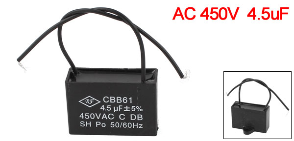 Product Name Motor Run Capacitor Model CBB61 Material Polypropylene Film Rated Capacitance 4.5uF Tolerance 5% Rated Frequency 50/60 Hz Rated Voltage AC 450V Overall Size 48 x 32 x 18mm/ 1.9" x 1.3" x 0.71"(L*W*T) Mount Hole Dia 5mm/ 0.2" Wire Length 11cm/ 4.3" Main Color Black Net Weight 28g Package Content 1 x Motor Run Capacitor - Reviews