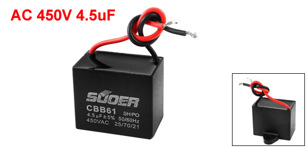 Product Name Motor Capacitor Model CBB61 Color Black External Material Plastic Dielectric Material Metalized Polypropylene Film Rated Capacitance 4.5uF Tolerance +5% Rated Frequency 50/60Hz Rated Voltage AC 450V Body Size 38 x 32 x 36mm/ 1.5" x 1.3" x 1.4"(L*W*T) Fixing Hole Diameter 5mm/0.2" Cable Length 9.5cm/ 3.7" Net Weight 36g Package Content 1 x Motor Run Capacitor - Reviews