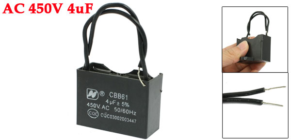 Product Name Motor Run Capacitor Model CBB61 Material Polypropylene, Plastic Rated Capacitance 4uF Tolerance 5% Rated Frequency 50/60 Hz Rated Voltage 450V AC Body Size 4.2 x 3 x 2.7cm/ 1.7" x 1.2" x 1.1"(L*W*H) Mount Hole Dia. 5mm/ 0.2" Wire Length 9cm/ 3.5" Main Color Black Weight 32g Package Content 1 x Motor Run Capacitor - Reviews