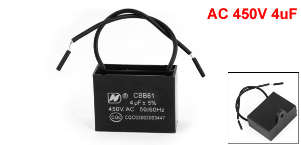 DetailsCBB61 AC 450V 4uF Rectangle Non Polar Motor Running Capacitor  Product Name Capacitor Model CBB61 Type Polypropylene Film Capacitor Material(External) Plastic Rated Capacitance 4uF±5% Rated Frequency 50/60Hz Rated Voltage 450VAC Size 4.2 x 3.2 x 1.8cm/1.7" x1.3" x 0.7"(L*W*T) Mounting Hole Diameter 4.5mm/0.18" Cable Length 9cm/3.5" Main Color Black Weight 30g Package Content 1 x Capacitor