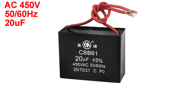 Terminal 2 Wires Ambient Temperature 25/70/21 Rated Capacitance 20uF Tolerance +/-5% Rated Frequency 50/60Hz Rated Voltage AC 450V Body Size 5.8 x 4.5 x 2.7cm / 2.3" x 1.8" x 1.1" (L*W*H) Wire Length 12cm / 5" Main Color Black, Red Weight 84g Package Content 1 x Motor Run Capacitor - Reviews
