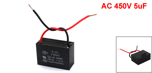 Product Name Motor Capacitor Model CBB61 Color Black External Material Plastic Dielectric Material Metalized Polypropylene Film Rated Capacitance 5uF Tolerance ±5% Rated Frequency 50/60Hz Rated Voltage AC 450V Ambient Temperature 25/70/21 Body Size 48 x 20 x 34mm/ 1.9" x 0.79" x 1.3"(L*W*T) Fixing Hole Diameter 5mm/0.20" Cable Length 10cm/ 4.0" Net Weight 38g Package Content 1 x Motor Capacitor - Reviews