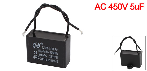 DetailsCBB61 AC 450V 5uF 50/60Hz Nonpolar Wired Motor Run Capacitor Black for Fan  Product Name Motor Run Capacitor Model CBB61 Material Polypropylene, Plastic Rated Capacitance 5uF Tolerance ±5% Rated Frequency 50/60 Hz Rated Voltage 450V AC Operating Temperature 40/70/21 Body Size 4.7 x 3.3 x 2cm / 1.85" x 1.3" x 0.8" (L*W*T) Mount Hole Dia. 5mm / 0.2" Wire Length 9cm / 3.5" Main Color Black Weight 41g Package Content 1 x Motor Run Capacitor