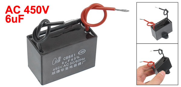 Product Name Motor Capacitor Model CBB61 External Material Plastic Dielectric Material Polypropylene Film Rated Capacitance 6uF Tolerance ±5% Rated Frequency 50/60Hz Rated Voltage AC 450V Max Temperature +70°C Body Size 4.7 x 3.2 x 2.2cm/ 1.9" x 1.3" x 0.9"(L*W*T) Mount Hole Diameter 5mm/0.2" Cable Length 9cm/ 3.5" Net Weight 39g Package Content 1 x Motor Run Capacitor - Reviews