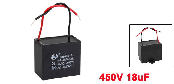 Product Name Motor Run Capacitor Material Polypropylene Film Rated Capacitance 18uF Tolerance ±5% Model CBB61 Rated Frequency 50/60 Hz Rated Voltage 450V AC Overall Size 49 x 41 x 43mm/ 1.9" x 1.6" x 1.7"(L*W*T) Mount Hole Dia 5mm/ 0.2" Wire Length 9cm/ 3.5" Main Color Black,Red Weight 82g Package Content 1 x Motor Run Capacitor - Reviews