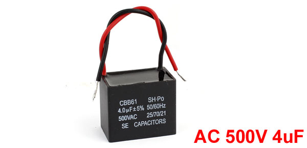 Product Name Motor Capacitor Housing Material Plastic Dielectric Material Metalized Polypropylene Model CBB61 Capacitance 4uF Tolerance ±5% Rated Voltage 500VAC Frequency 50/60Hz Body Size 4 x 3 x 3.5cm/1.6 x 1.2 x 1.4 inches(L*W*H) Wire Length(Approx.) 8cm / 3.2" Color Black Weight 35g Package Content 1 x Motor Capacitor - Reviews