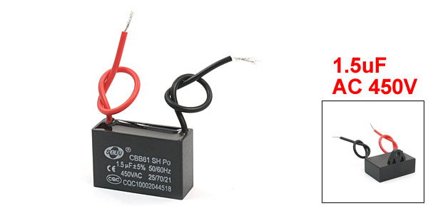 Product Name Motor Capacitor Model CBB61 External Material Plastic Dielectric Material Metalized Polypropylene Film Rated Capacitance 1.5uF Tolerance ±5% Rated Frequency 50/60Hz Rated Voltage AC 450V Body Size 37 x 23 x 14mm/ 1.5" x 0.91" x 0.55"(L*W*T) Fixing Hole Diameter 4.5mm/0.18" Cable Length 11cm/4.3" Net Weight 18g Package Content 1 x Motor Run Capacitor - Reviews