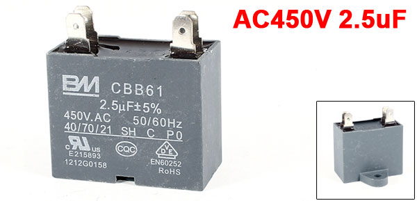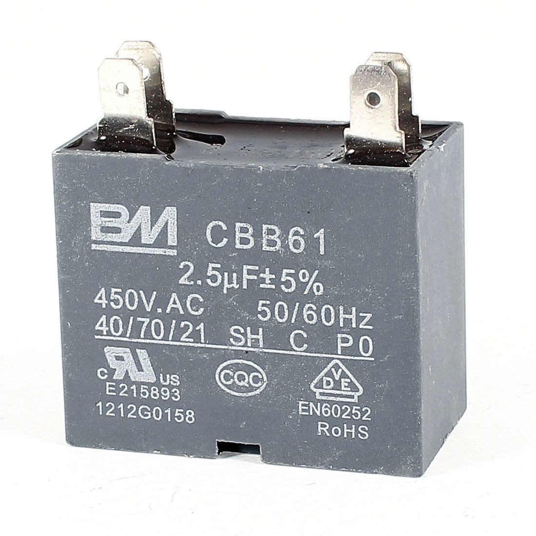 Product Name Motor Capacitor Material Polypropylene Film Model CBB61 Rated Capacitance 2.5uF Rated Frequency 50/60 Hz Rated Voltage 450V AC Overall Size 37 x 32 x 40mm/ 1.4" x 1.28" x 1.6"(L*W*H) Mount Hole Dia 4.5mm/ 0.2" Pin Size 8 x 5mm/ 0.31" x 0.2"(L*W) Pin Spacing 21x 5mm/ 0.8" x 0.2"(L*W) Main Color Gray Net Weight 30g Package Content 1 x Motor Capacitor - Reviews