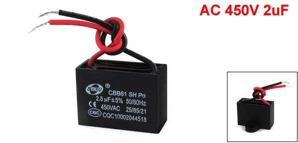 Product Name Motor Capacitor Model CBB61 External Material Plastic Dielectric Material Metalized Polypropylene Film Rated Capacitance 2uF Tolerance ±5% Rated Frequency 50/60Hz Rated Voltage AC 450V Rated Frequency 25/85/21 Body Size 38 x 29 x 17mm / 1.5" x 1.2" x 0.7" (L*W*T) Fixing Hole Diameter 4mm / 0.16" Cable Length 10cm / 4" Net Weight 23g Package Content 1 x Motor Run Capacitor - Reviews