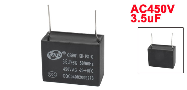 Product Name Motor Capacitor Model CBB61 External Material Plastic Dielectric Material Polypropylene Film Rated Capacitance 3.5uF Tolerance ±5% Rated Frequency 50/60Hz Voltage AC 450V Body Size 38 x 28 x 16mm/ 1.5" x 1" x 0.6"(L*W) Pin Space 30mm/ 1.2" Weight 42g Package Content 2 x Motor Run Capacitor - Reviews