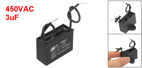 Product Name Capacitor Model CBB61 Dielectric Material Metallized Polypropylene External Material Plastic Rated Capacitance 3uF Tolerance ±5% Rated Frequency 50/60Hz Rated Working Voltage 450VAC Mounting Hole Diameter 4.5mm / 0.17" Boby Size 4 x 1.6 x 2.8cm / 1.6" x 0.64" x 1.1" (L*W*H) Wire Length(Each) 9cm / 3.5" Main Color Black Weight 22g Package Content 1 x Capacitor - Reviews