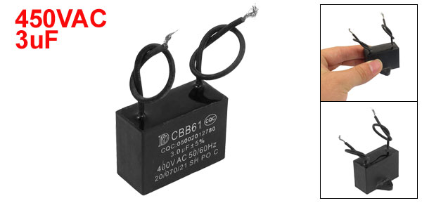 Product Name Capacitor Model CBB61 Dielectric Material Metallized Polypropylene External Material Plastic Rated Capacitance 3uF Tolerance 5% Rated Frequency 50/60Hz Rated Working Voltage 450VAC Mounting Hole Diameter 4.5mm / 0.17" Boby Size 3.9 x 1.7 x 2.8cm / 1.55" x 0.69" x 1.1" (L*W*H) Wire Length(Each) 10cm / 3.9" Main Color Black Weight 25g Package Content 1 x Capacitor - Reviews