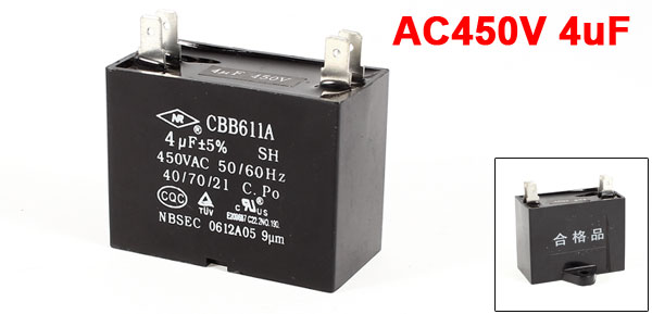 Product Name Motor Capacitor Material Polypropylene Film Model CBB61 Rated Capacitance 4uF Rated Frequency 50/60 Hz Rated Voltage 450V AC Overall Size 47 x 34 x 42mm/ 1.88" x 1.36" x 1.68"(L*W*H) Mount Hole Dia 4.5mm/ 0.2" Pin Size 7.8 x 5mm/ 0.3" x 0.2"(L*W) Pin Spacing 27x 7.7mm/ 1" x 0.3"(L*W) Main Color Black Net Weight 44g Package Content 1 x Motor Capacitor - Reviews