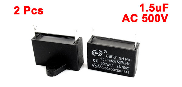 Product Name Motor Run Capacitor Material Polypropylene Film Rated Capacitance 1.5uF Tolerance ±5% Model CBB61 Rated Frequency 50/60 Hz Rated Voltage AC 500V Overall Size 35 x 25 x 13mm/ 1.3" x 1" x 0.5"(L*W*T) Mount Hole Dia 4.5mm/ 0.18" Pin Spacing 30mm/ 1.2" Main Color Black Weight 27g Package Content 2 x Motor Run Capacitor - Reviews