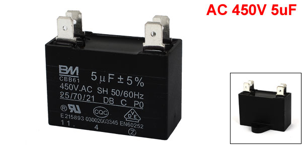 Product Name Capacitor Housing Material Plastic Dielectric Material Metalized Polypropylene Model CBB61 Capacitance 5uF Tolerance ±5% Rated Voltage 450VAC Frequency 50/60Hz Temperature Range 25/70/21 Body Size 4.5 x 2 x 3cm / 1.77" x 0.8" x 1.2" (L*W*H) Pin Spacing 3.4 x 0.9cm / 1.34" x 0.35" (L*W) Color Black Weight 39g Package Content 1 x Capacitor - Reviews