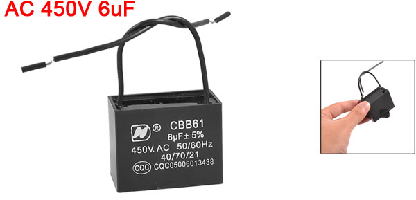 Product Name Motor Capacitor Model CBB61 External Material Plastic Dielectric Material Metalized Polypropylene Rated Capacitance 6uF Tolerance +/-5% Rated Frequency 50/60Hz Rated Voltage AC 450V Size 4.5 x 3.5 x 2.5cm/ 1.8" x 1.4" x 1" (L*W*T) Hole Dia. 4.3mm/ 0.17" Cable Length 11cm/ 4.3" Weight 53g Package Content 1 x Motor Run Capacitor - Reviews