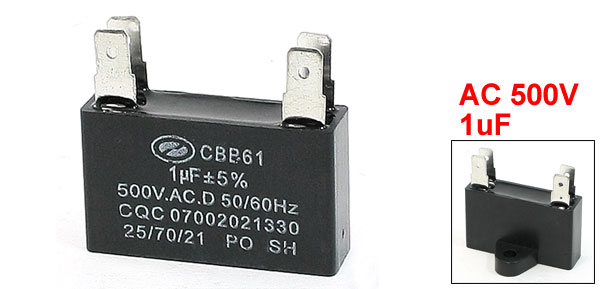 Product Name Capacitor Model CBB61 Type Polypropylene Film Capacitor Material(External) Plastic Rated Capacitance 1uF Tolerance +/-5% Rated Frequency 50/60Hz Rated Voltage 500V.AC.D Size 3.6 x 1 x 2.2cm/1.42" x 0.4" x 0.87"(L*W*T) Pin Length 1.1cm/0.43" Pin Width 6mm/0.24" Distance between Pins 2cm/0.4" 0.5cm/0.2" Mount Hole Diameter 4mm/0.16" Main Color Black Weight 12g Package Content 1 x Capacitor - Reviews