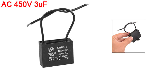DetailsCBB61 Model Polypropylene Film Motor Run Capacitor AC 450V 3uF  Product Name Motor Capacitor Model CBB61 External Material Plastic Dielectric Material Metalized Polypropylene Rated Capacitance 3uF Tolerance +/-5% Rated Frequency 50/60Hz Rated Voltage AC 450V Size 4.3 x 3.2 x 1.8cm/ 1.7" x 1.3" x 0.7" (L*W*T) Hole Dia. 4mm/ 0.16" Cable Length 10cm/ 3.9" Weight 32g Package Content 1 x Motor Run Capacitor