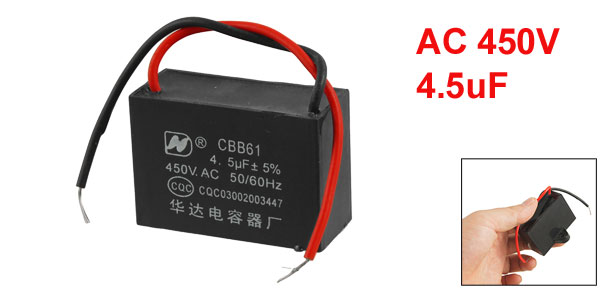 Product Name Motor Capacitor Model CBB61 Material(External) Plastic Rated Capacitance 4.5uF Tolerance +/-5% Rated Frequency 50Hz/60Hz Rated Voltage 450V AC Size 4.8 x 3.3 x 2cm/1.9" x 1.3"x 0.79"(L*W*T) Color Black Cable Length 10cm/ 3.9" Weight 44g Package Content 1 x Motor Run Capacitor - Reviews