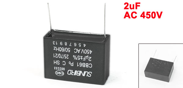 Product Name Motor Capacitor Model CBB61 Capacitance 2uF Tolerance ±5% Rated Voltage 450V AC Frequency 50/60Hz Temperature Coefficient 25/70/21 Lead Spacing(Approx.) 3.3cm/1.3'' Lead Length 2cm/0.8'' Overall Size 3.6 x 2.6 x 1.5cm/1.4" x 1" x 0.41"(L*W*H) Housing Material Plastic Dielectric Material Polypropylene Film Color Black Weight 18g Package Content 1 x Motor Capacitor - Reviews