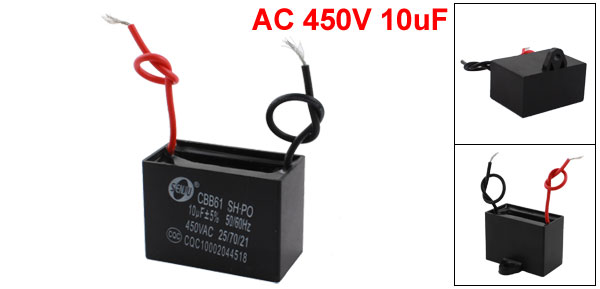 Product Name Capacitor Model CBB61 Rated Capacitance 10uF Tolerance ±5% Rated Voltage AC 450V Frequency 50/60Hz Body Size 4.8 x 3.5 x 2.7cm / 1.9" x 1.4" x 1.1"(L*W*T) Wire Length 8cm / 3" Main Material Polypropylene Film, PVC Main Color Black Weight 46g Package Content 1 x Capacitor - Reviews