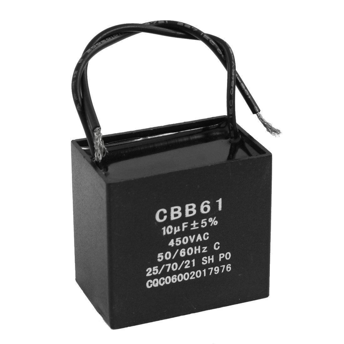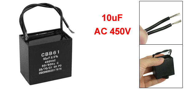 Product Name Motor Capacitor Model CBB61 External Material Plastic Dielectric Material Metalized Polypropylene Rated Capacitance 10uF Tolerance 5% Rated Frequency 50/60Hz Rated Voltage AC 450V Size 4.6 x 4.3 x 4.1cm/ 1.8" x 1.7" x 1.6"(L*W*T) Hole Dia. 0.45cm/ 0.18" Cable Length 9cm/ 3.5" Weight 73g Package Content 1 x Motor Run Capacitor - Reviews