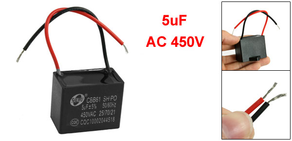 Product Name Motor Capacitor Model CBB61 Material(External) Plastic Dielectric Material Metallized Polypropylene Film Rated Capacitance 5uF Tolerance 5% Rated Frequency 50/60Hz Rated Voltage AC 450V Size 4 x 3.2 x 3.3cm/ 1.6" x 1.2"x 1.3"(L*W*T) Cable Length 8cm/ 3.1" Color Black, Red Weight 38g Package Content 1 x Motor Run Capacitor - Reviews