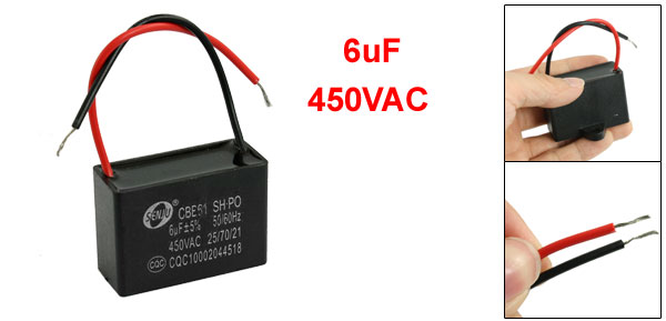 Product Name Capacitor Model CBB61 Type Polypropylene Film Capacitor Material(External) Plastic Rated Capacitance 6uF Ambient Temperature 25/70/21 Tolerance ±5% Rated Frequency 50/60Hz Rated Voltage 450VAC Size 4.6 x 3.2 x 3.3cm/1.8" x 1.2" x 1.3"(L*W*T) Cable Length 8cm/3.1" Main Color Black Weight 39g Package Content 1 x Capacitor - Reviews