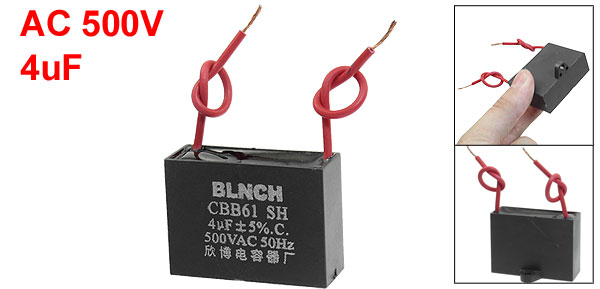 Product Name Motor Capacitor Model CBB61 External Material Plastic Dielectric Material Metalized Polypropylene Film Rated Capacitance 4uF Tolerance +/-5% Rated Frequency 50Hz Rated Voltage AC 500V Body Size 4.7 x 1.8 x 3.4cm/ 1.9" x 0.7" x 1.3"(L*W*T) Mount Hole Diameter 4mm/0.16" Cable Length 8cm/ 3.1" Net Weight 35g Package Content 1 x Motor Run Capacitor - Reviews